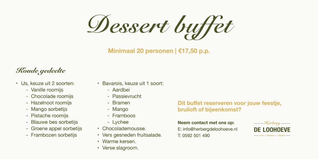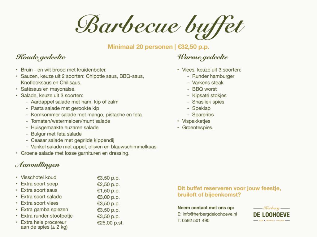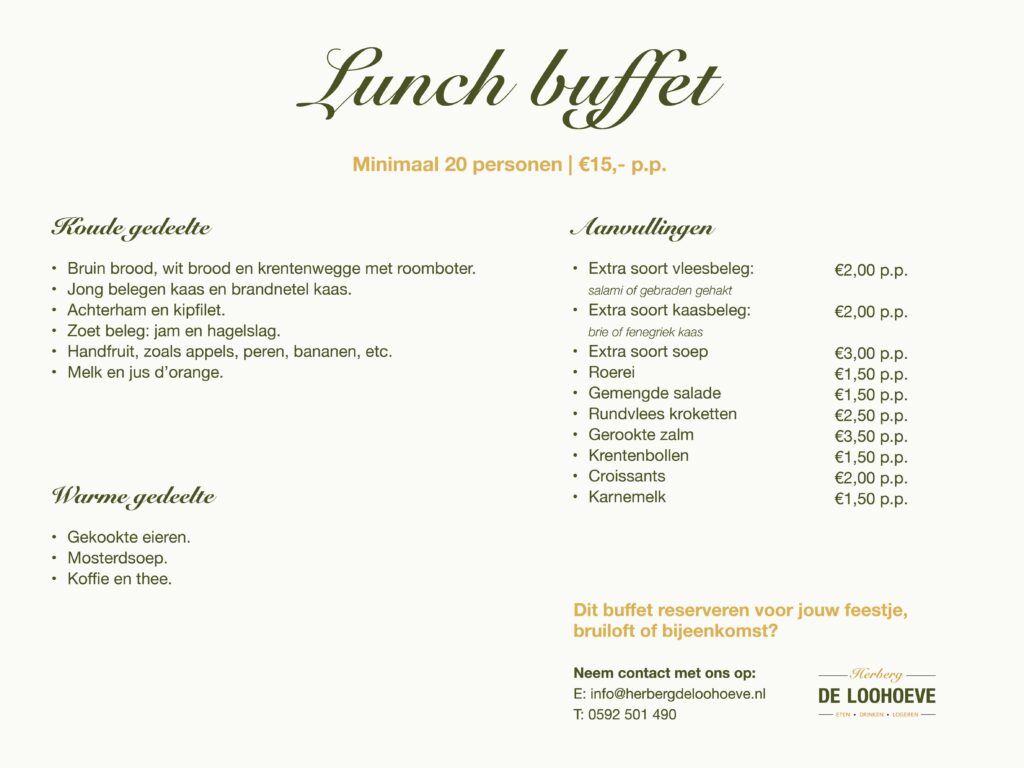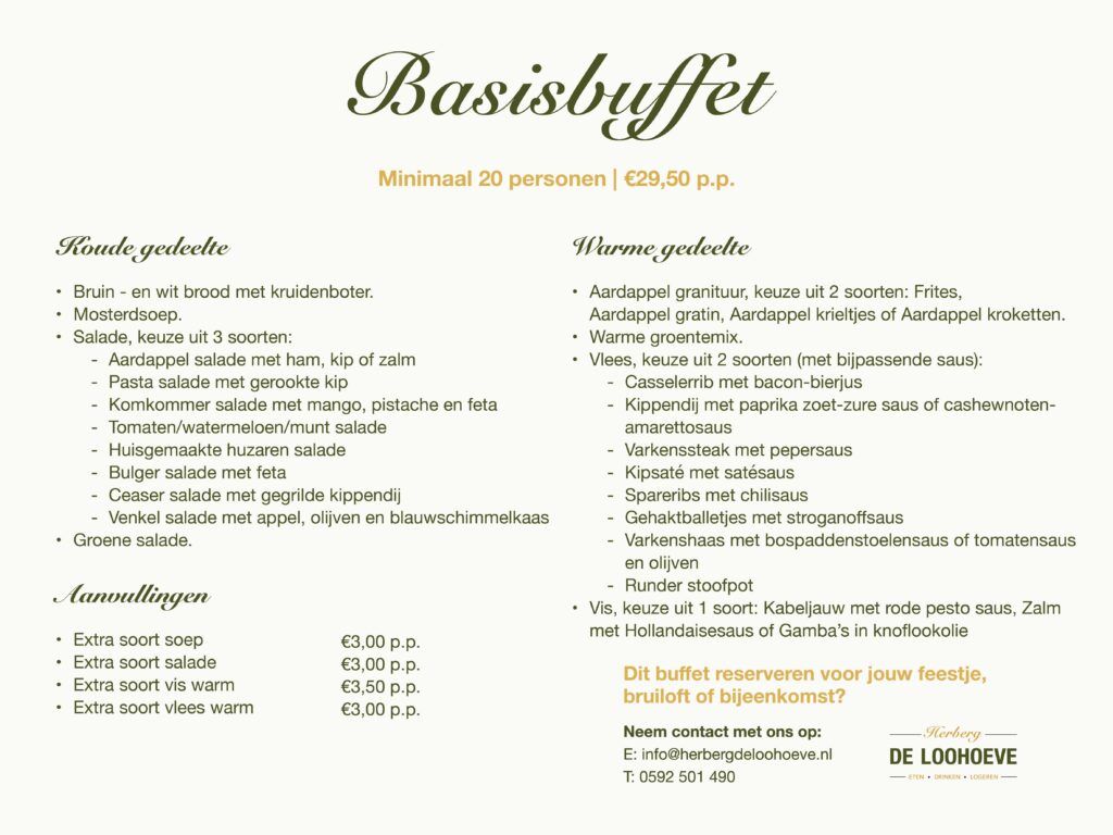 Bekijk hieronder onze buffetten of vraag meer informatie: mail naar reserveringen@herbergdeloohoeve.nl of bel 0592 501 490.
