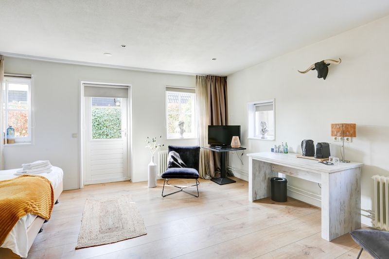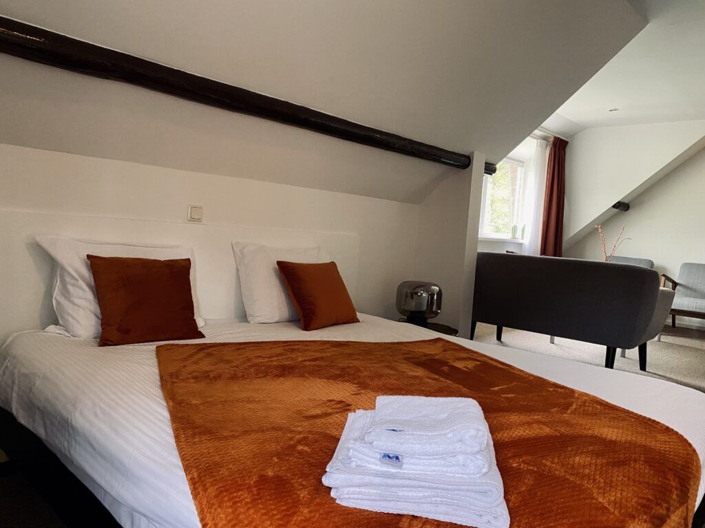 Overnacht in onze rustgevende suite, de Hooizolder. Deze kamer vind je op de bovenverdieping en heeft een kingsize bed, een badkamer met bad en een heerlijke zithoek waar je je kunt terugtrekken met een goed boek. In deze kamer heb je vanuit je dakkapel een prachtig uitzicht over de tuin en de vijver. Een perfecte kamer om langere tijd te verblijven. Je kunt in De Hooizolder ook een extra bed laten plaatsen als je dat wilt.